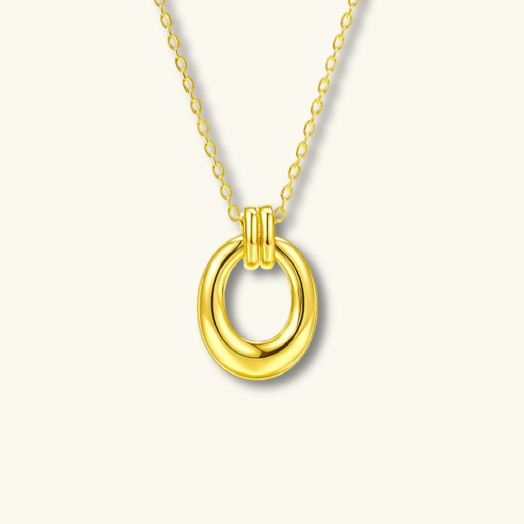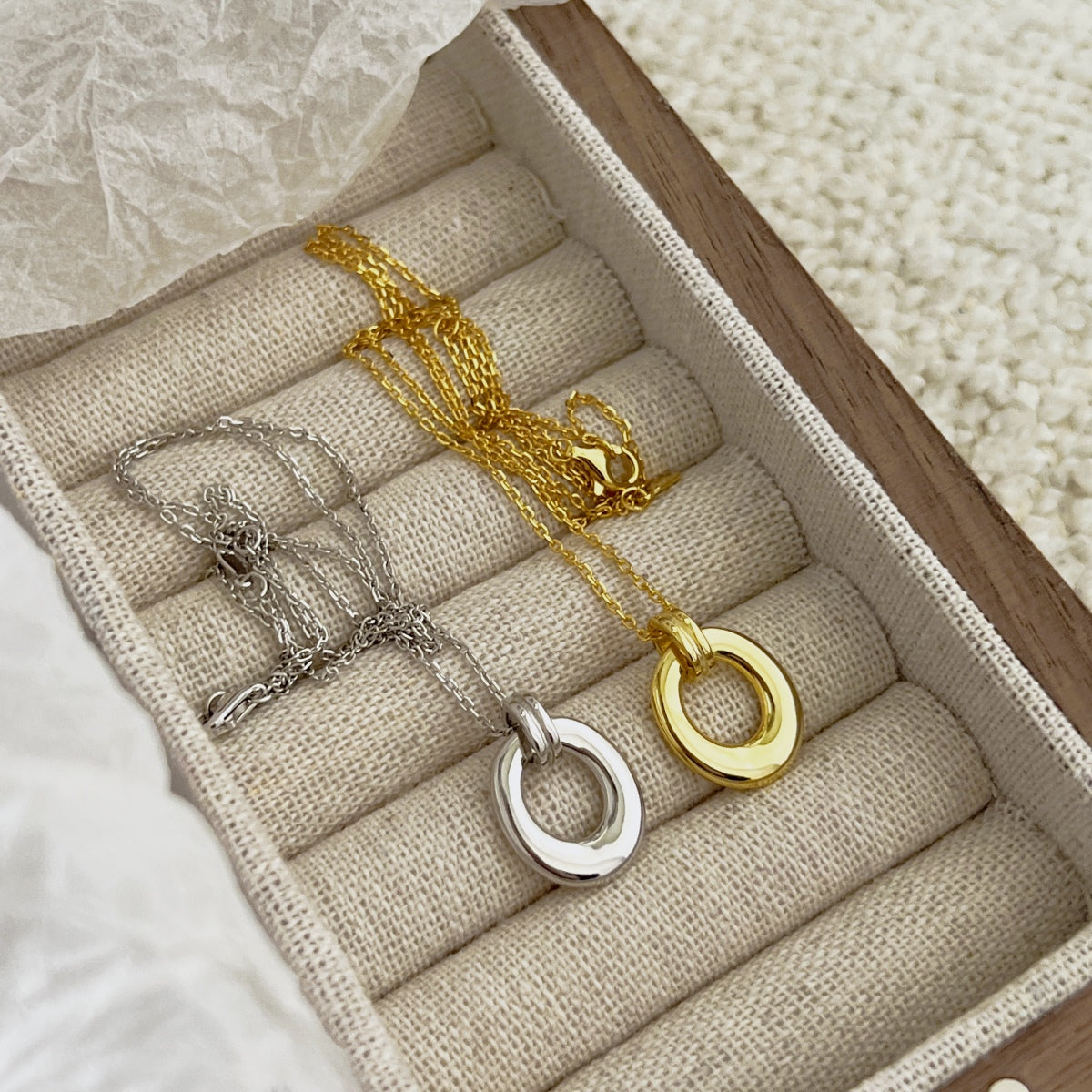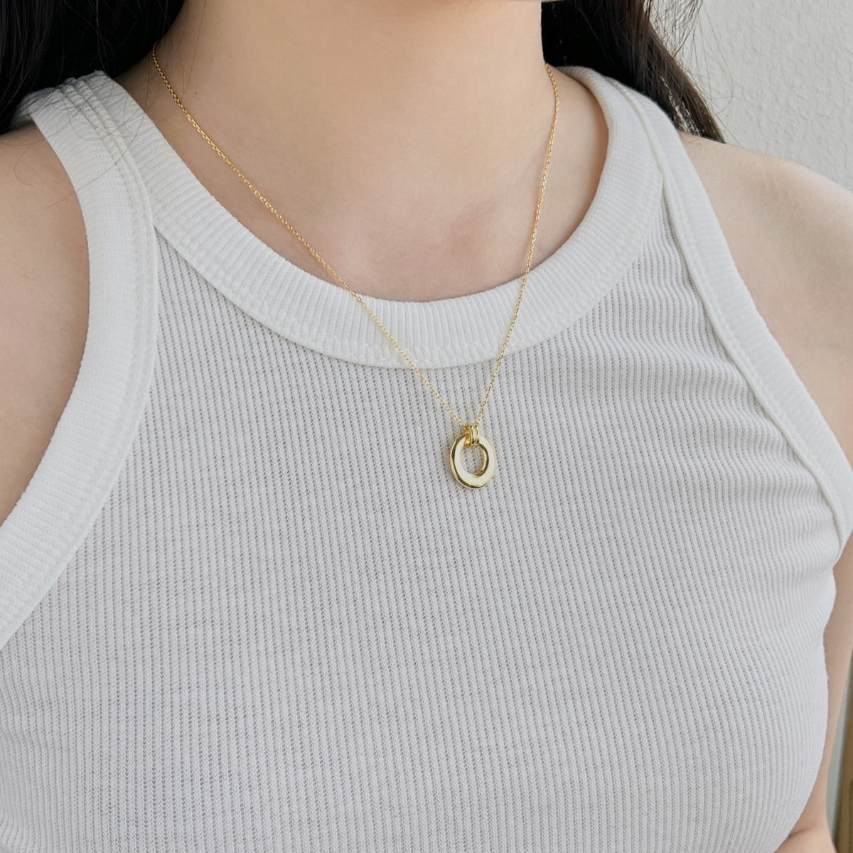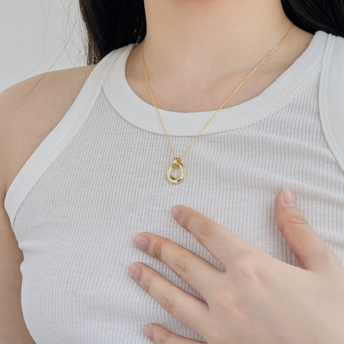 This necklace features a flawlessly smooth hollow circle pendant threaded onto two slim accent rings. Suspended from a fine cable chain, its warm golden sheen catches and reflects light with every movement, creating an effortless, modern look perfect for daily wear or layering. The clean, minimalist silhouette adds a subtle yet striking statement to any ensemble.