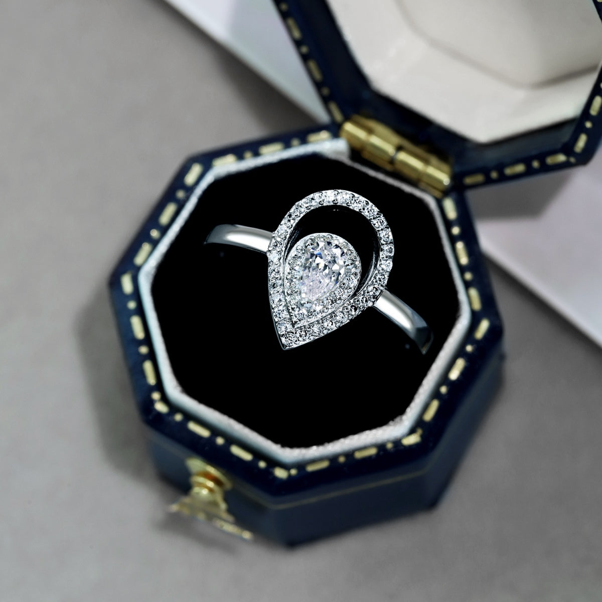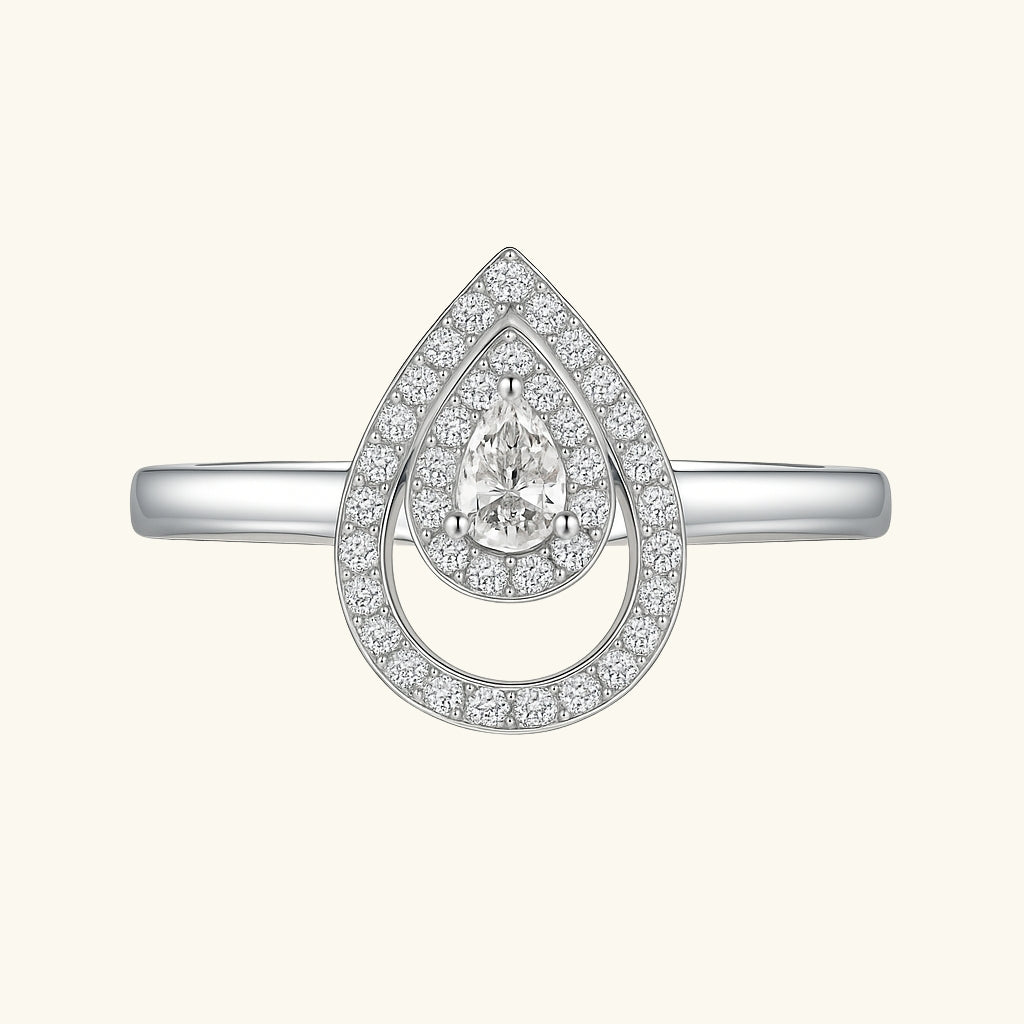 Experience modern elegance with this pear-shaped center stone, gracefully suspended within a double teardrop halo. The open, layered silhouette adds depth and dimension, enhancing the ring’s captivating sparkle. Whether for a special occasion or everyday chic, it’s a sophisticated statement of timeless beauty.