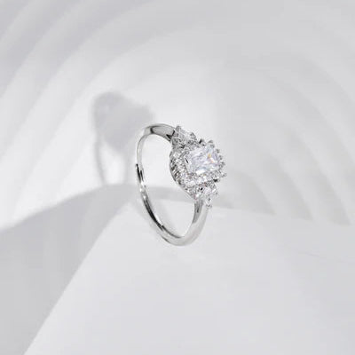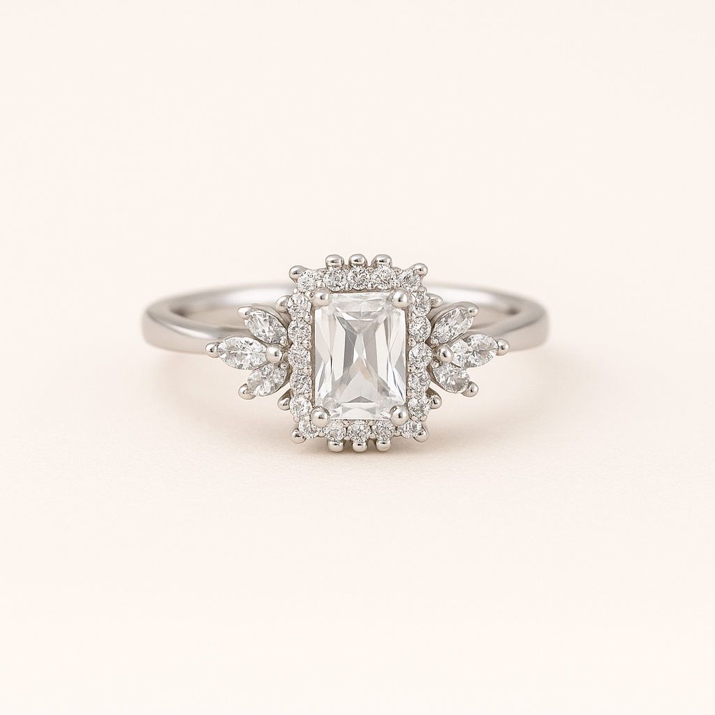 Add a touch of fairy-tale romance to your look with this radiant-cut center stone ring, adorned by floral-inspired clusters on each side. Its intricate design captures vintage elegance while offering a modern, graceful silhouette. Whether for a special occasion or a heartfelt gift, this ring is sure to enchant and delight.