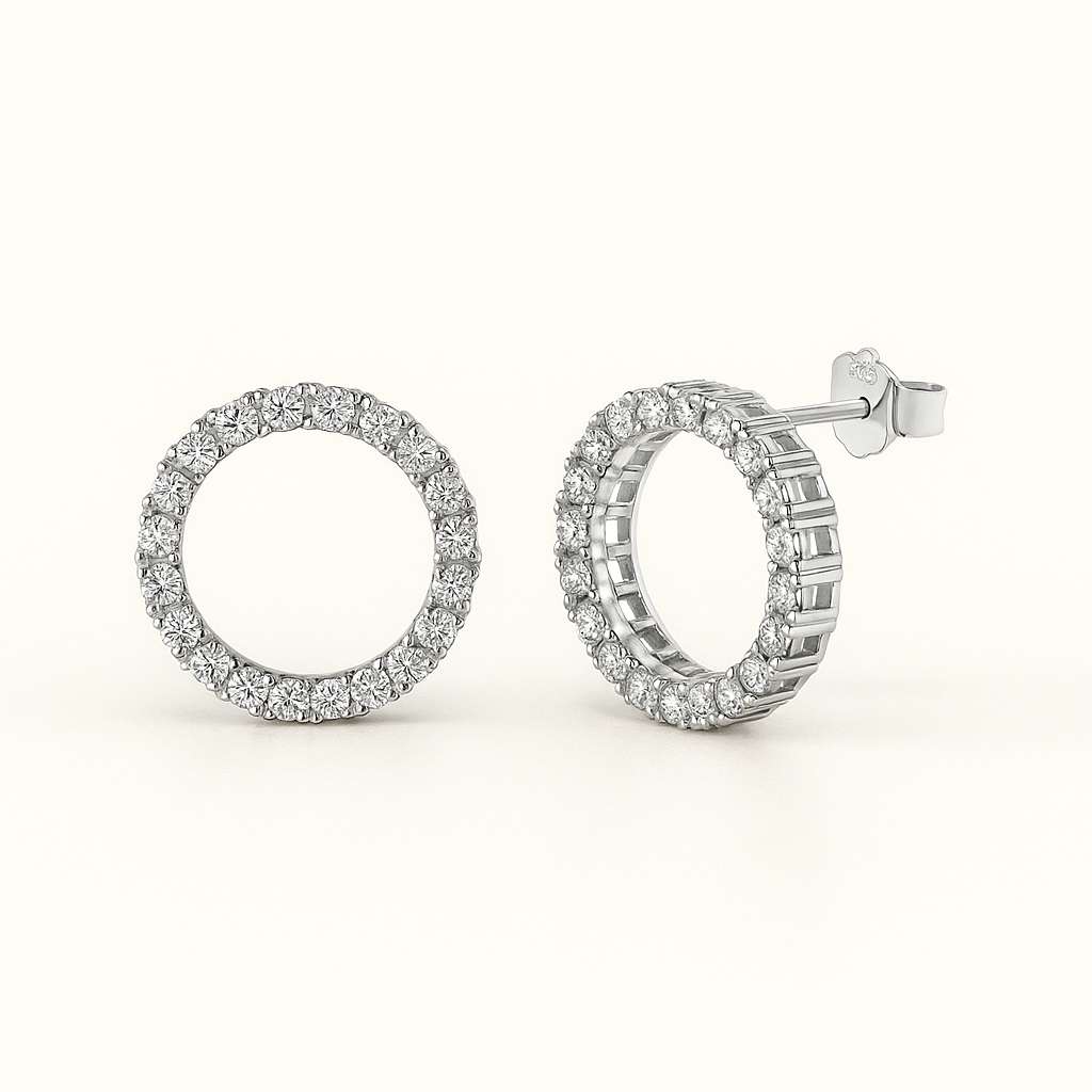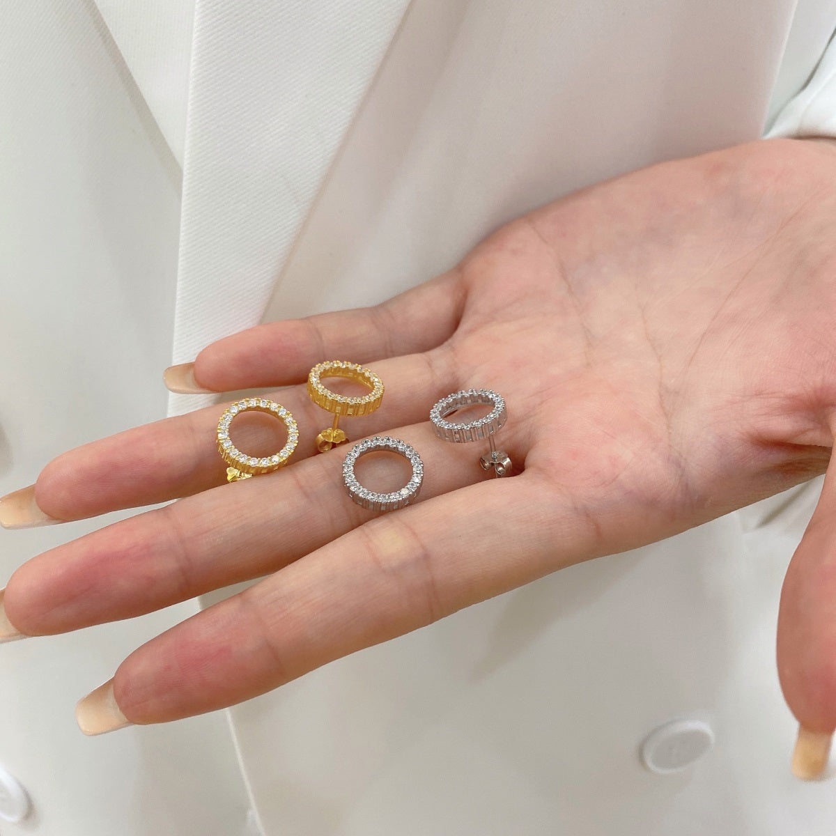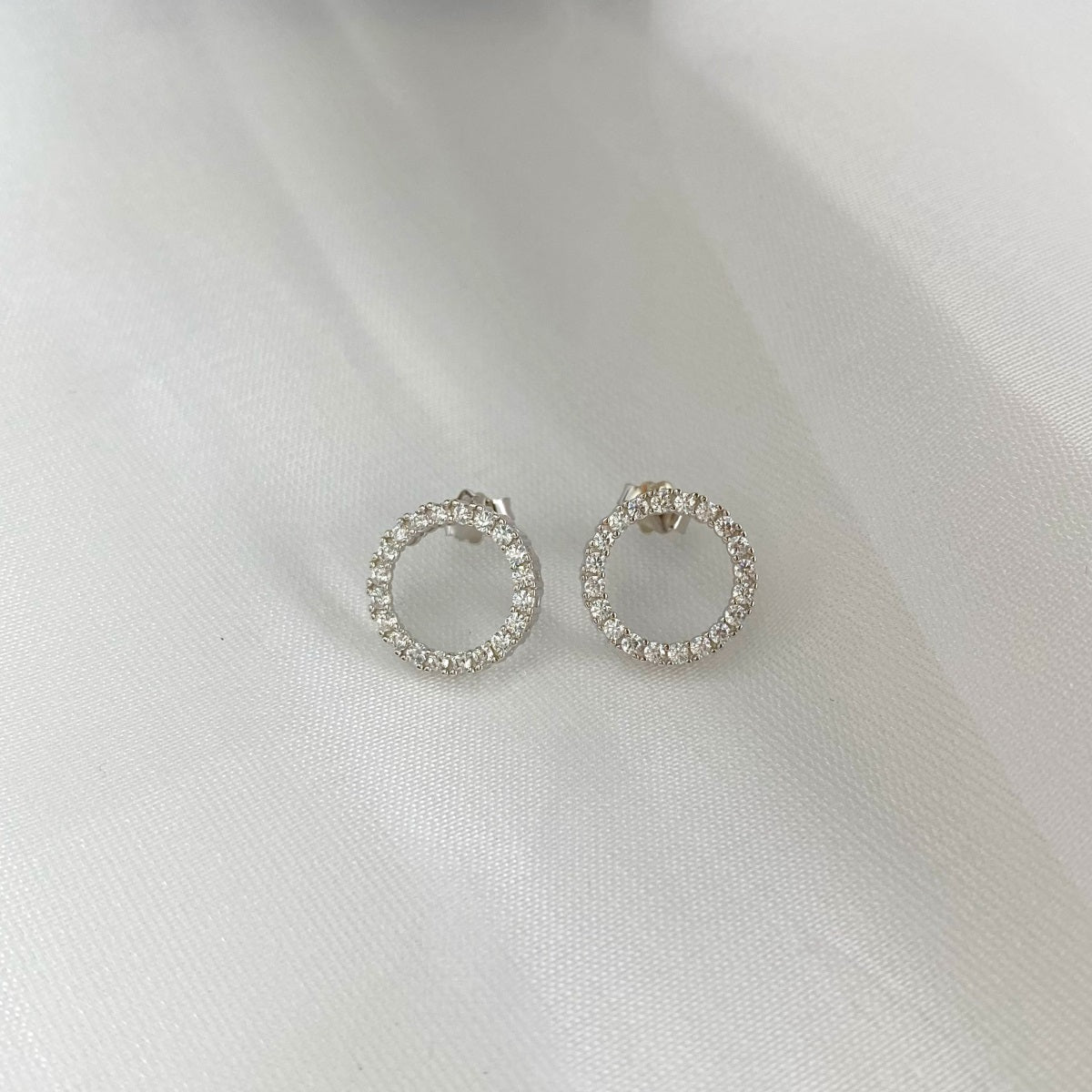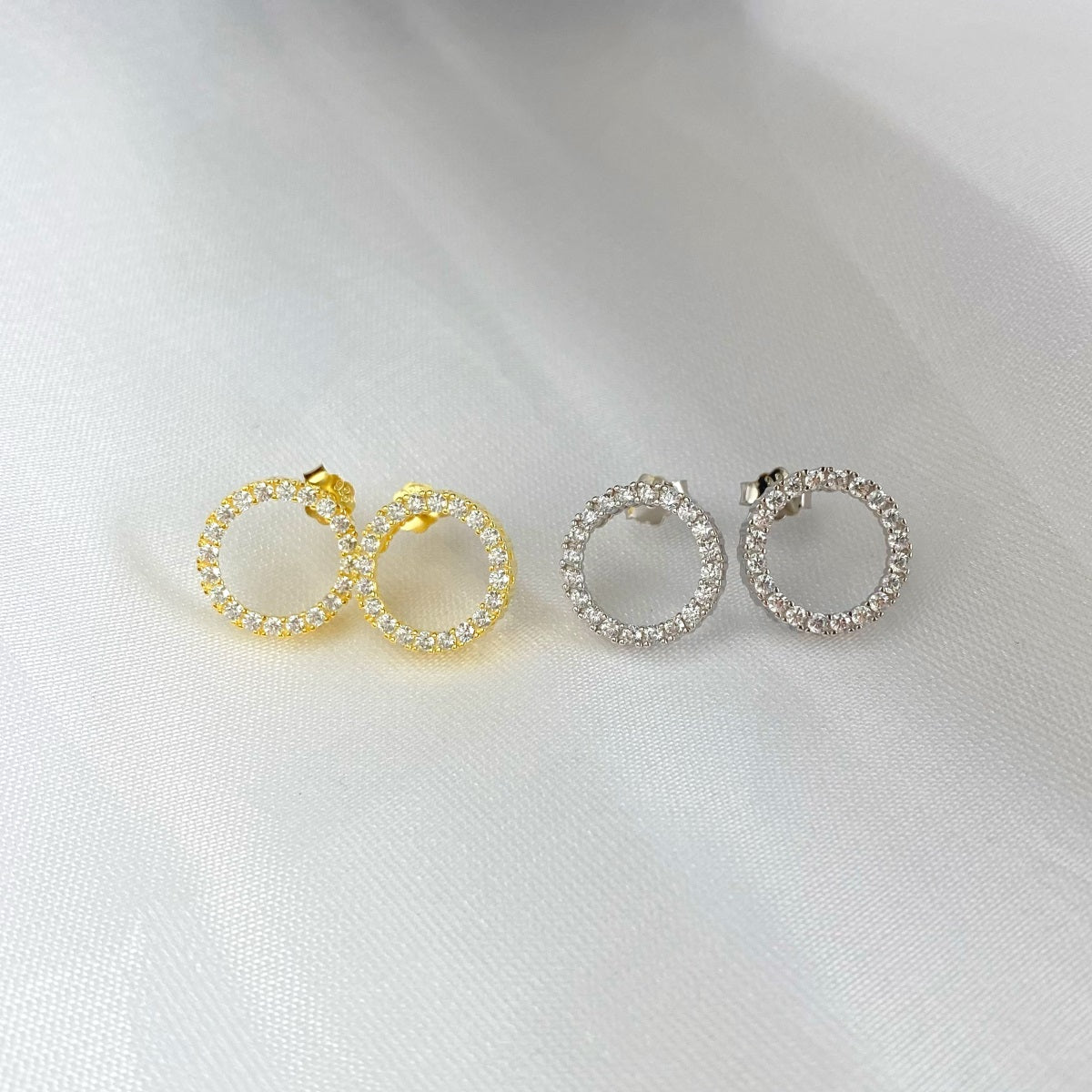 Adorn your ears with these chic circle stud earrings, meticulously set with a ring of sparkling stones. The open-circle design offers a fresh, minimalist aesthetic that pairs beautifully with both casual and formal outfits. Elevate your everyday style or add a subtle statement to evening looks with this timeless accessory.